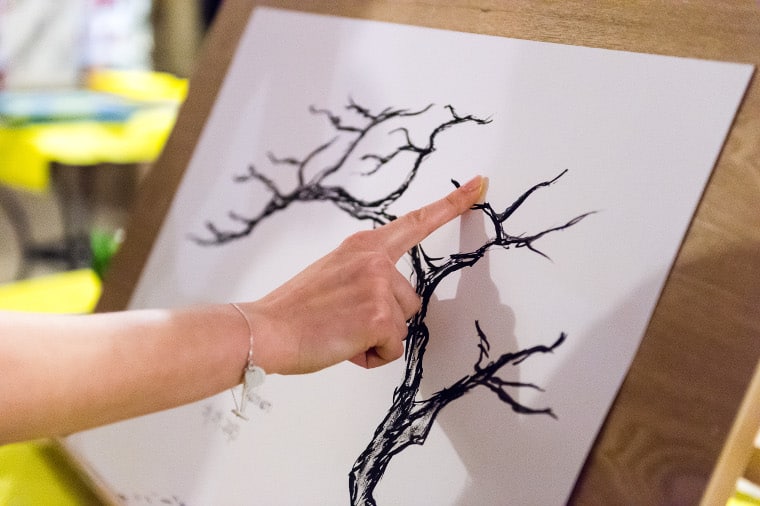 Le principe de ce rituel est de façonner un tableau à plusieurs dizaines de mains. C’est à l’aide d’un peu de peinture que chacun.e vient poser son empreinte sur le dessin d’un arbre aux branches nues. Chaque empreinte représentera alors une feuille de l’arbre qui s’étoffera au fur et à mesure.