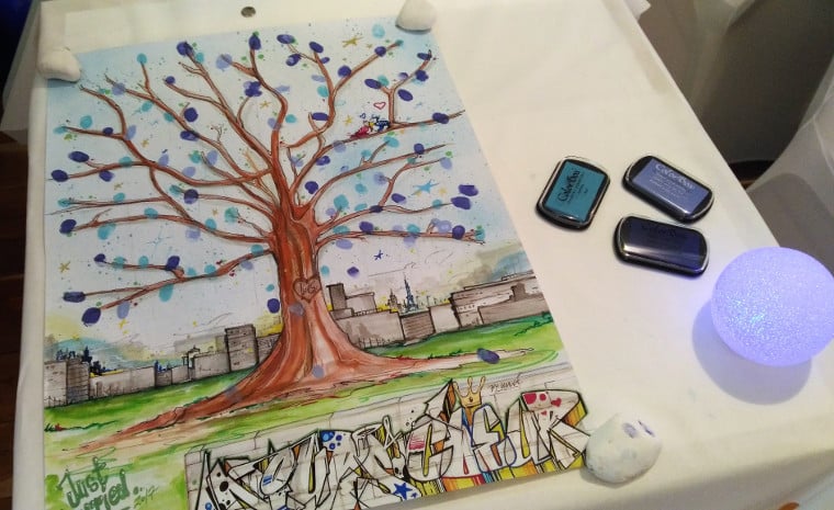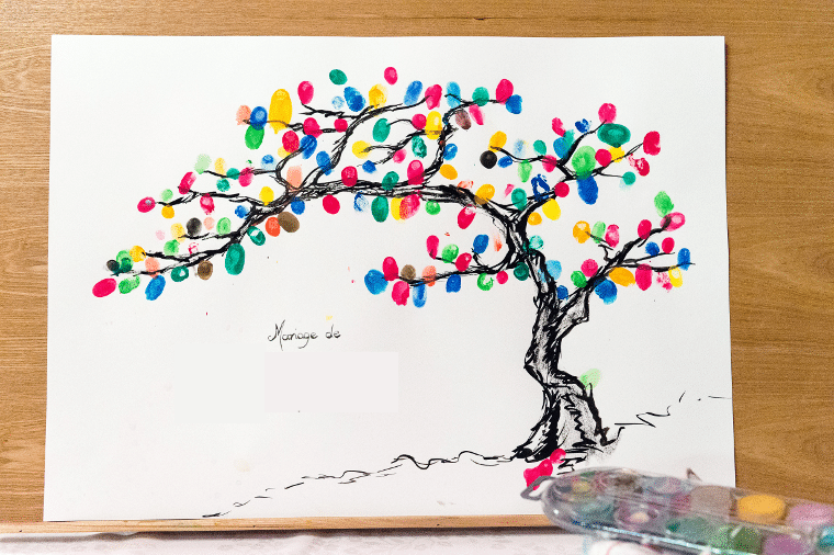 Plusieurs modèles d’arbres existent sur internet et votre officiant.e peut également vous en proposer. Mais vous pouvez aussi faire appel à vos ami.e.s à la fibre artistique pour le dessin. Ce serait l’occasion d’avoir un arbre à empreintes parfaitement unique comme celui de Laetitia et Guillaume qui illustre l’article.