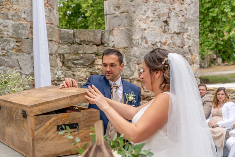 D’abord, avant la cérémonie, on identifie le ou les objets qu’on souhaite déposer dans cette boite à souvenirs. Cela peut être simplement une bouteille de vin et on rejoint alors le rituel du vin scellé, mais cela peut aller plus loin. Vous pouvez y glisser vos vœux, un livre que vous aimez tous les deux, voire quelques surprises (un cadeau ou une lettre adressée à l’autre qu’il ou elle découvrira à l’ouverture de la capsule).