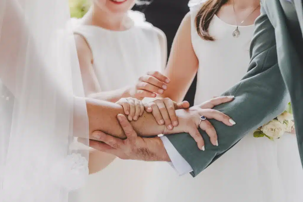 Que diriez-vous de proposer à vos proches de participer à un rituel par exemple ? Dans celui des rubans, ils noueront des liens autour de vos poignets pendant que votre officiant.e évoquera les valeurs représentées par ces rubans. Demandez aussi aux timides d’être les premières personnes à déposer la marque de leurs doigts sur l’arbre à empreintes. Si vous avez très envie de donner une place à votre grand-mère mais qu’elle préfère ne pas s’exprimer à voix haute, vous pouvez lui confier les alliances. Qui a dit qu’il n’y a que les enfants qui devaient apporter les anneaux aux mariés !