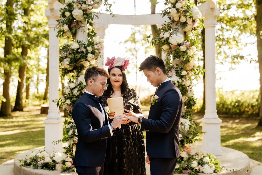 L’échange des alliances, c’est un des moments phare de la cérémonie. Ce passage, souvent solennel, est chargé du sens que les deux anneaux portent en eux et porteront chaque jour à vos doigts.
