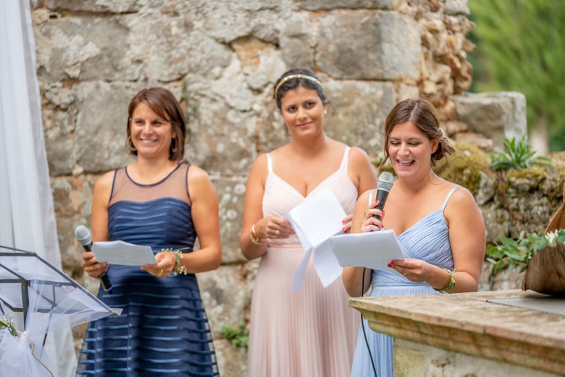 Dès le deuxième rendez-vous, Elodie et Raphaël ont décidé d’entremêler leurs témoins pour les discours. Ainsi, nous avons formé deux duos avec, à chaque fois, un témoin de l’un et de l’autre. Une bonne manière de dresser des portraits croisés des mariés et de créer du rythme dans les discours !