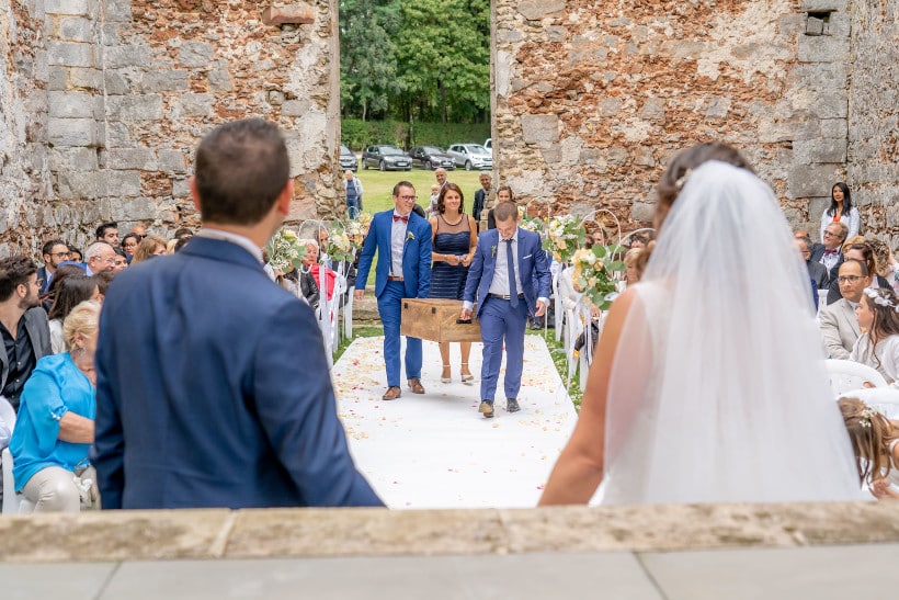 A eux deux, Elodie et Raphaël ont quatre enfants. Leur petite dernière venant compléter une jolie famille recomposée. Chacun et chacune y a sa place et sa personnalité. Nos deux amoureux tenaient particulièrement à symboliser l’importance de chacun dans cette grande famille qu’ils ont construite. Que ce soit à travers mes mots, les leurs ou le rituel qu’ils ont choisi. Ils ont également fait un clin d’œil à leurs familles d’origine, y choisissant d’abord trois de leurs quatre témoins.