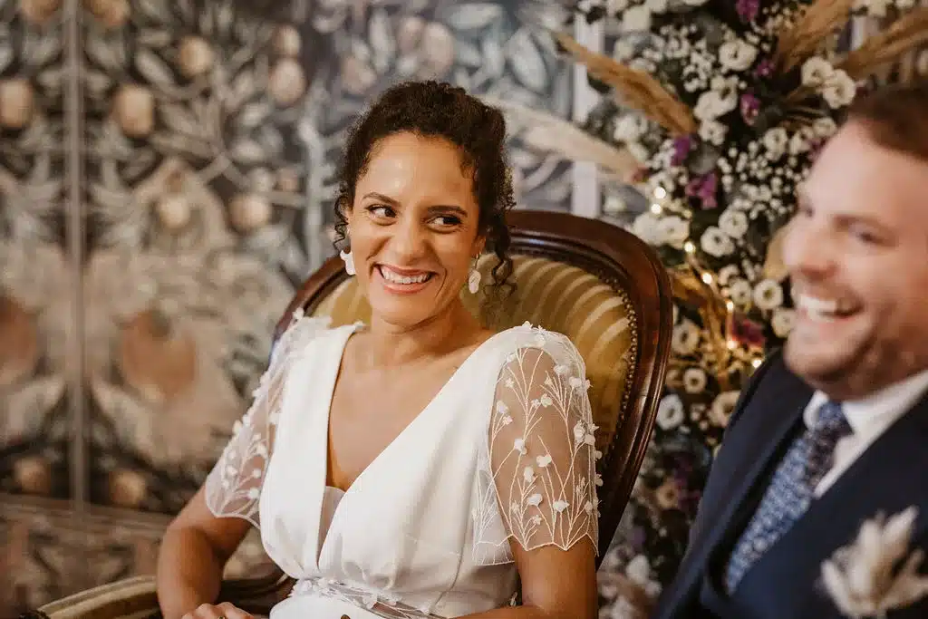 Le jour J Émilie a été plus qu’une maîtresse de cérémonie. Elle a été d’une aide précieuse pour gérer les petits imprévus de dernière minute, allant même jusqu’à nous aider à improviser une déco chaleureuse pour nous créer un petit cocon afin de pallier la déception de ne pas faire la cérémonie en extérieur. Cela nous a permis d’aborder sereinement ce moment chargé d’émotions.