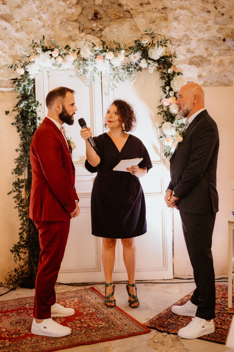 Quand nous avons décidé de nous marier il y a un an, il est très vite devenu évident que nous souhaitions une cérémonie laïque pour partager ce moment unique avec nos familles et nos proches. Notre « ami » google nous a tout de suite mis sur le chemin de « Pour une cérémonie ». Emilie ayant officié pour des couples de garçons nous avons alors pris contact avec elle et dès notre première conversation téléphonique nous avons eu un coup de cœur, devenu coup de foudre lors de notre première rencontre.