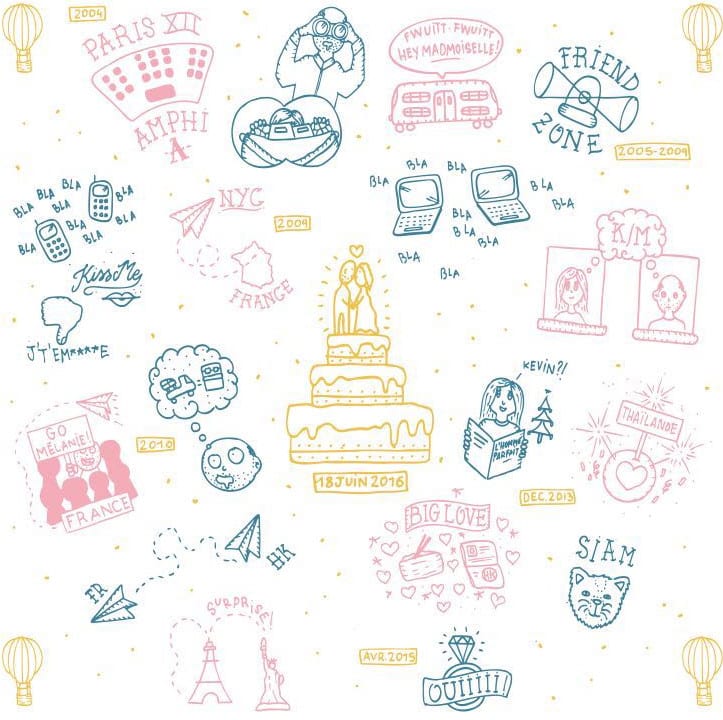 Vous imaginez bien qu’il s’en est passé des choses pendant tout ce temps. Pour les raconter Laetitia a fait appel à un graphiste qui immortalisé chaque moment important par un dessin. Cette histoire graphique a été imprimée et distribuée sur chaque chaise de la mairie, comme un programme au théâtre ou à l’opéra. Tous les invités l’ayant en main, Laetitia et Elise ont pu prendre un moment dans leur discours pour décrypter les étapes. Les mariés ont adoré et les invités aussi.